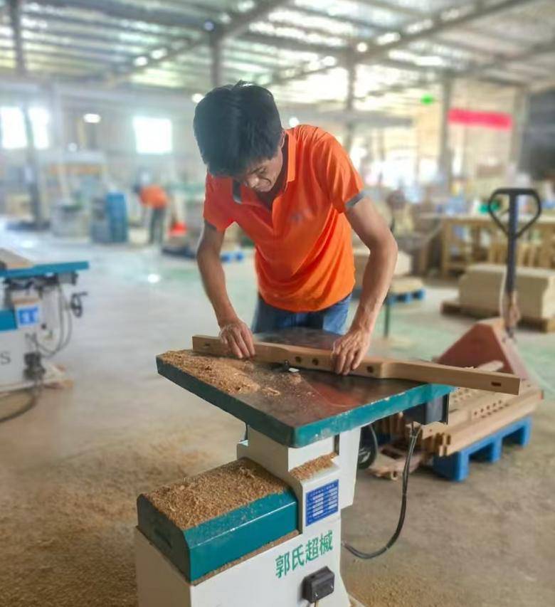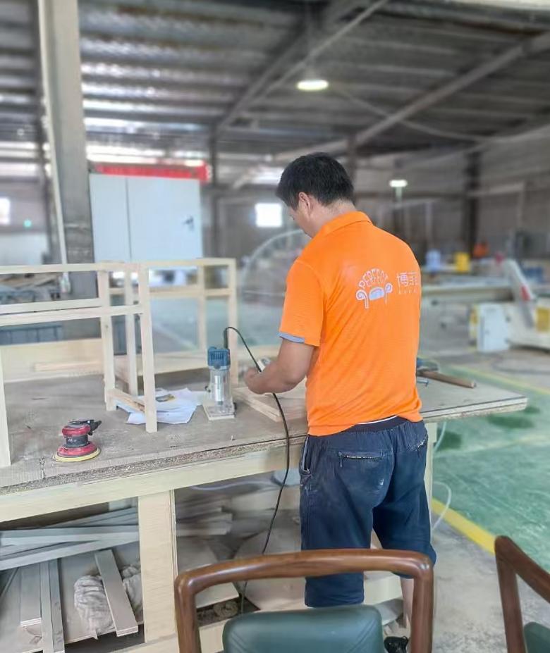 木工劉師傅:我家就是涇陽本地的,以前在四川一家酒店家具生產工廠打工,后面在西安藍田的家具廠上了兩年班。去年六月份,我們廠長聯(lián)系我讓我來博菲克,那天跟老板聊了一個多小時,我之所以選擇在這里上班,是覺得這家企業(yè)管理很人性化,老板年輕有為有擔當,是個干事業(yè)的人!這幾年很多工廠效益都不太好,舉步維艱,對于我們打工的人來說,更希望能找個穩(wěn)定的工廠,每天有活干才能有錢掙。博菲克的銷售團隊也很厲害,訂單很多,有時候都做不過來,但是我們加班也有加班費,雖然辛苦一點,但總比那些沒有活干的工廠強吧。