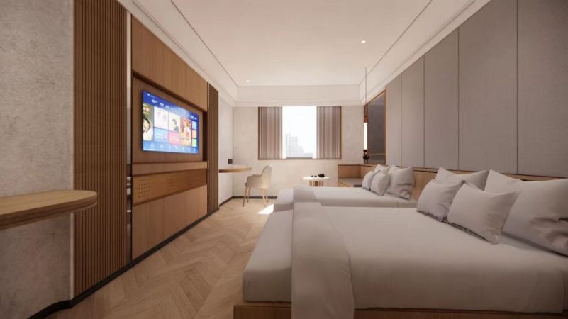 前面我們說(shuō)過(guò),客戶的酒店位置絕佳,處于城中心的廣場(chǎng)旁。因此,即使是二次翻新改造,客戶依然沒(méi)有采用家具貼膜的方式去圖省錢,而是要重新設(shè)計(jì)酒店客房,再按照效果圖去定制家具。